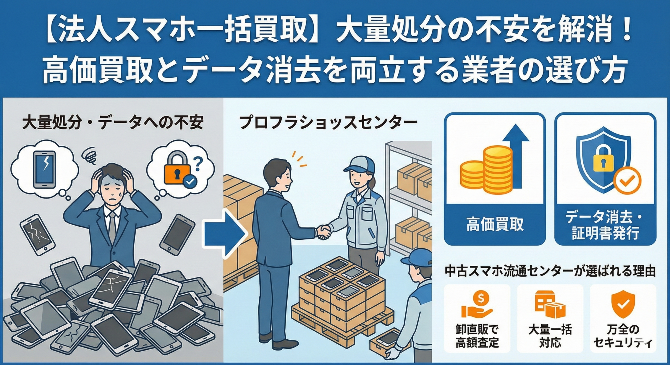 法人の資産管理担当者や情報システム部門の方にとって、社用スマホの一括処分は非常に神経を使う業務です。個人向けの買取店では対応しきれない「大量一括査定」や、法人特有の「厳格なデータ消去」が求められるからです。