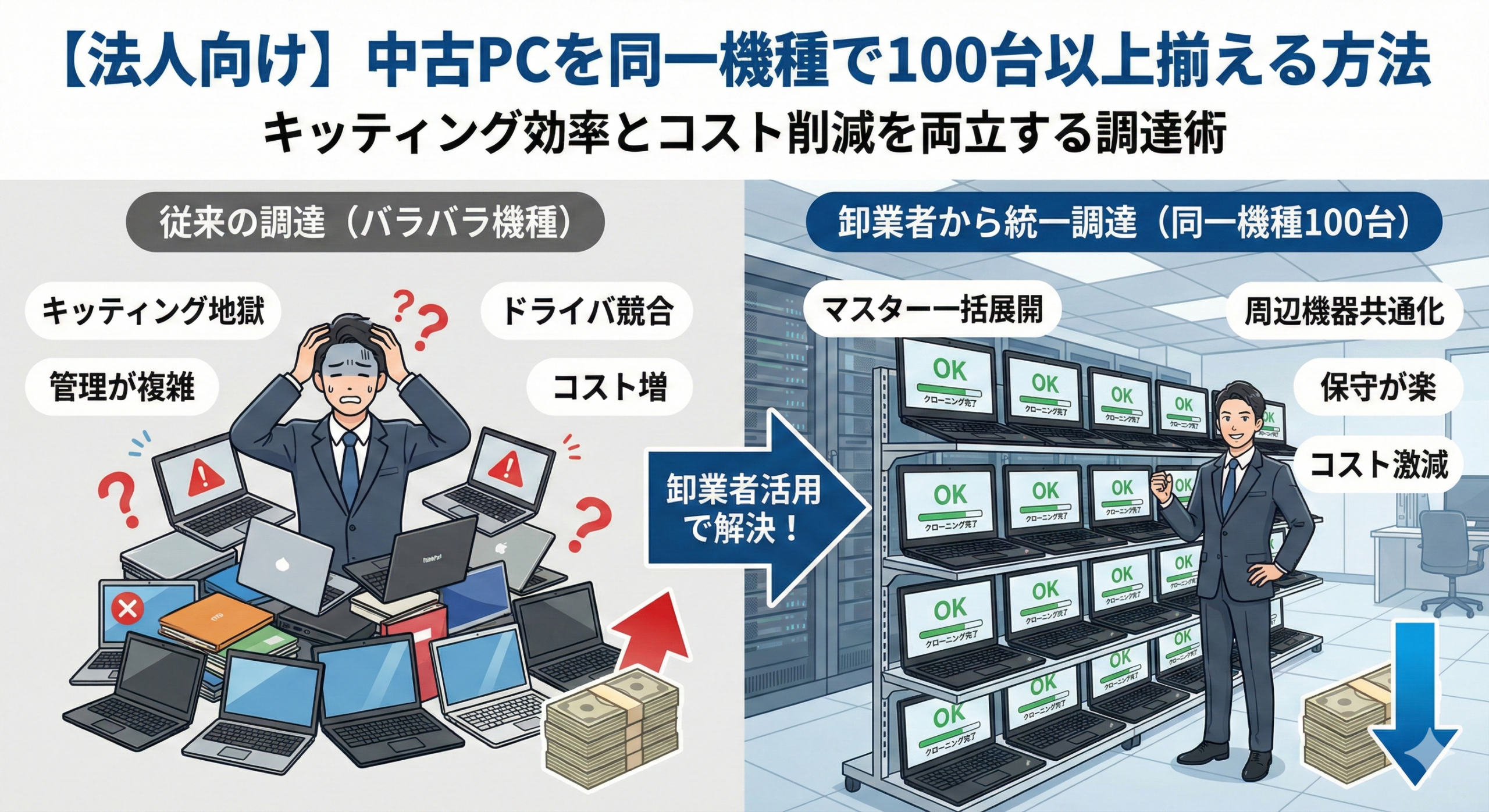 中古PCを同一機種で100台以上導入することは、初期コストを新品の半分以下に抑えるだけでなく、導入後数年間の「管理コスト」を最小化するための最高戦略です。