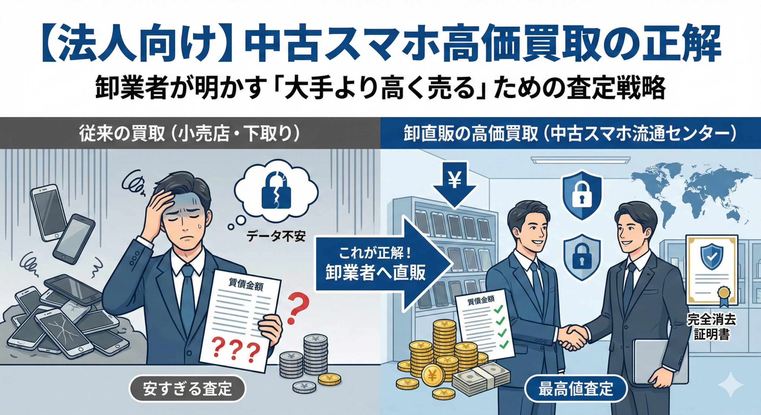 結論から申し上げます。法人スマホを最高値で売却したいなら、**「小売店」ではなく「卸業者」**へ直接査定を依頼してください。