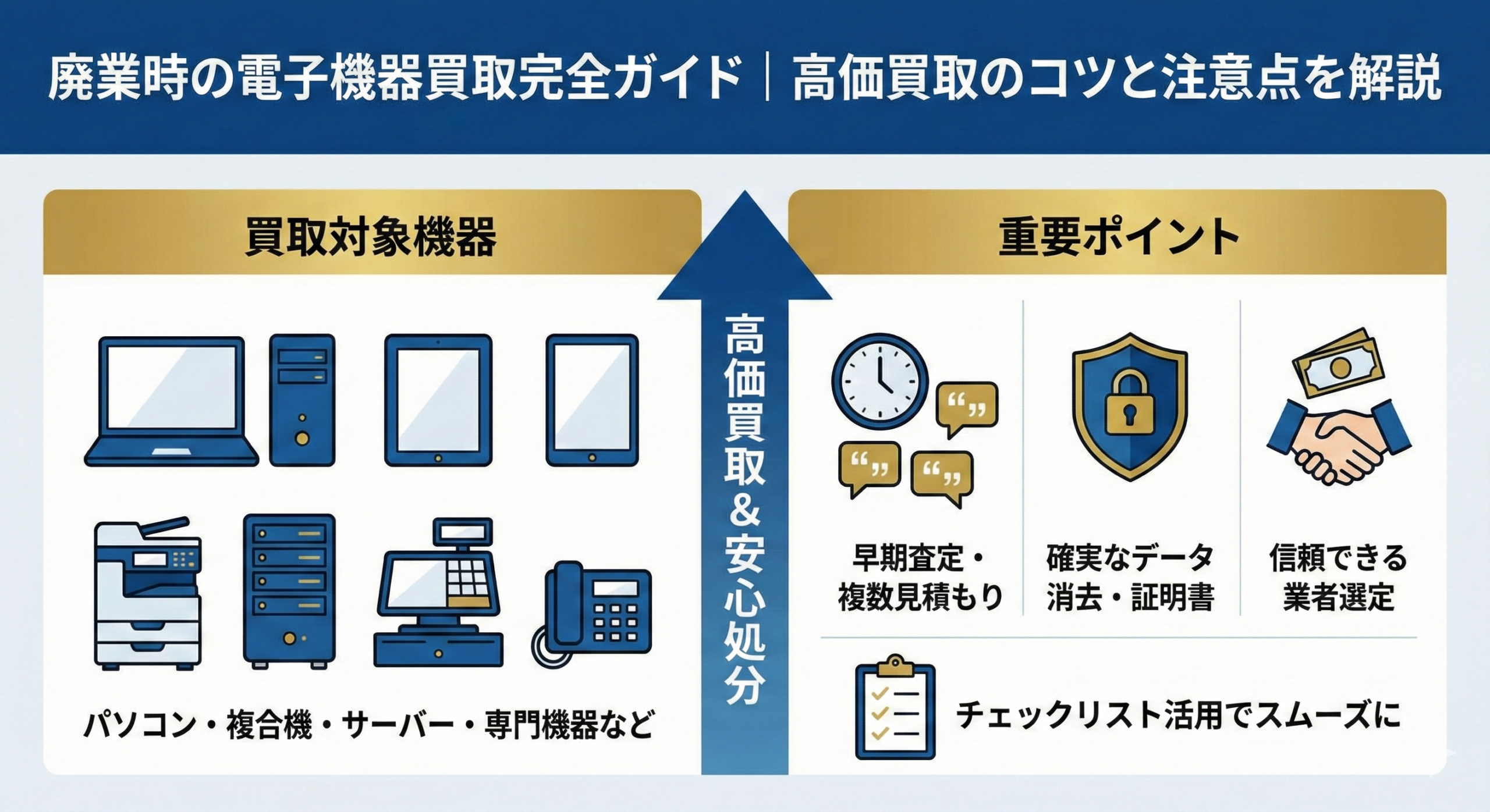 廃業時の電子機器買取は、適切に進めることで処分コストを削減し、場合によっては数十万円から数百万円の収入を得られる可能性があります。重要なポイントは以下の5つです。