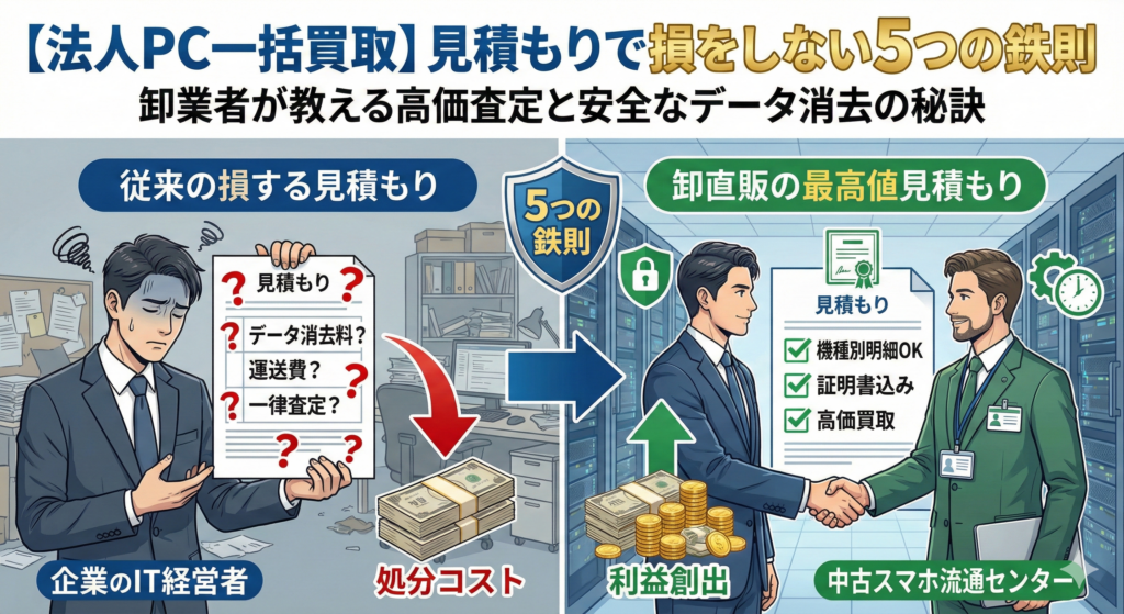 【法人PC一括買取】見積もりで損をしない5つの鉄則|卸業者が教える高価査定と安全なデータ消去の秘訣