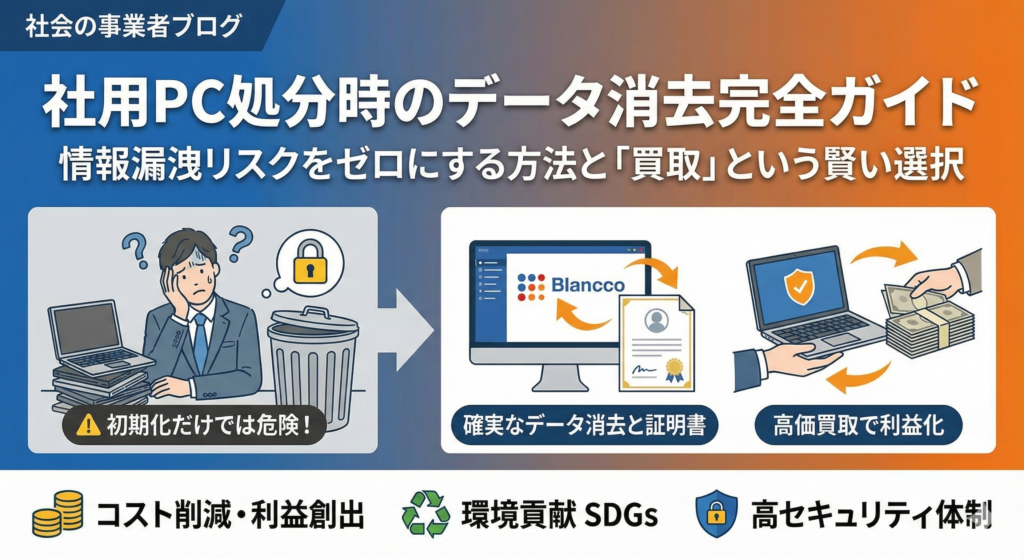 会社で長年使用してきたノートパソコンやデスクトップPC。リプレイス(買い替え)の時期を迎えた際、最も頭を悩ませるのが**「古いPCの処分とデータ消去」**ではないでしょうか。 「ゴミとして捨てるには忍びないが、データが残ったまま外に出すのは怖すぎ... -